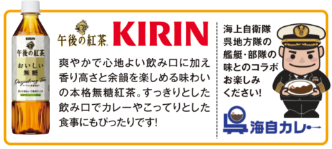 呉海自カレーをお召し上がりのお客様にはカレー1食に「キリン午後の紅茶美味しい無糖」を1本お配りいたします。(数に限りがございます)